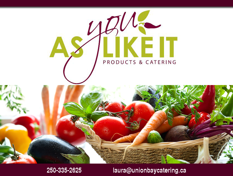 Welcome to "As you Like it" Products & Catering It is stated in the Shakespearian play “As You Like It”; “Can one desire too much of a good thing?” Local business owner, Laura Agnew of “As You Like It Products & Catering” believes you cannot. Located in the kitchen at the old school in Union Bay (UBID office), her goal is to supply the local region with gourmet food and food products using local, all natural foods, prepared 'As you like it' at a reasonable price. Laura’s apprentice-ship included attending the Culinary Olympics in Frankfort Germany the first year Canada won a gold medal. She achieved her Red Seal certification with the Hilton hotels and has for over 30 years, worked with several other top quality hotels and fine eateries around the world. With the extensive traveling she has done, it makes her an ideal candidate to offer you these diverse flavours. For just yourself or having a party, "As You Like It" is able to accommodate. "As You Like It" can work within most budgets for all styles of meals and is able to meet the most demanding dietary needs to provide personalized take home meals for your dinner or freezer She also has a product line which is available at the Comox Valley farmer’s market most Saturdays and in stores around the Vancouver Island. PO BOX273, Union Bay BC Canada VOR 3B0 |